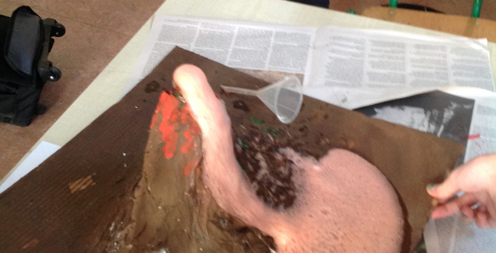 They created a chemical reaction by mixing an acid and an alkali together. They mixed 3 teaspoons of baking soda, a few drops of washing up liquid, 500ml of water, a few drops of food colouring and 250ml of vinegar together to create their own pyroclastic flow.