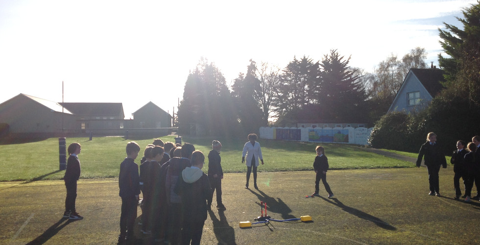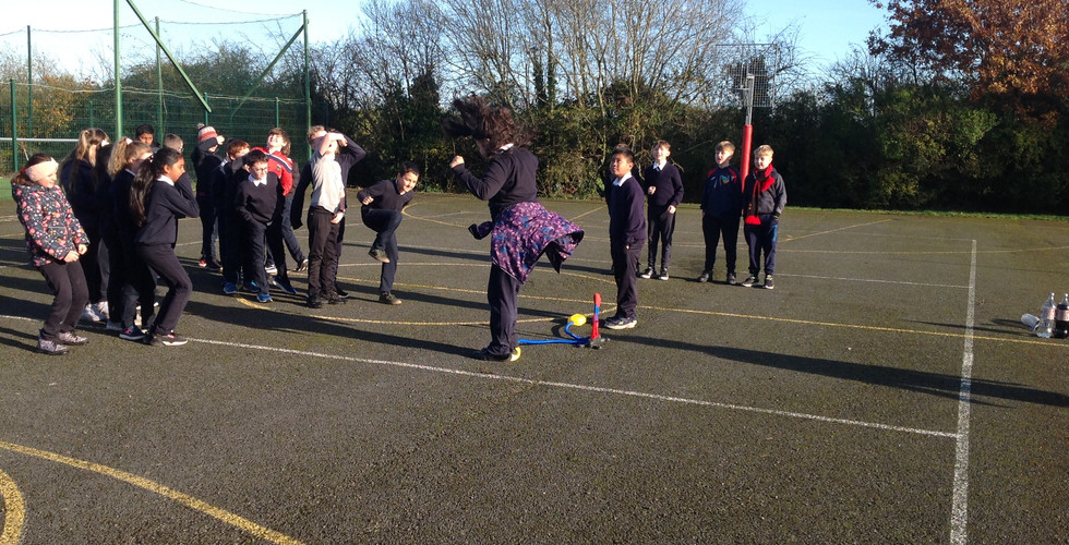 As part of 'Science Week', 3rd and 4th class had a very special visitor on Wednesday the 16th of November. Lucretia Hardiman, a scientist from The National University of Galway, visited the school to complete some science experiments on the school yard involving rockets.