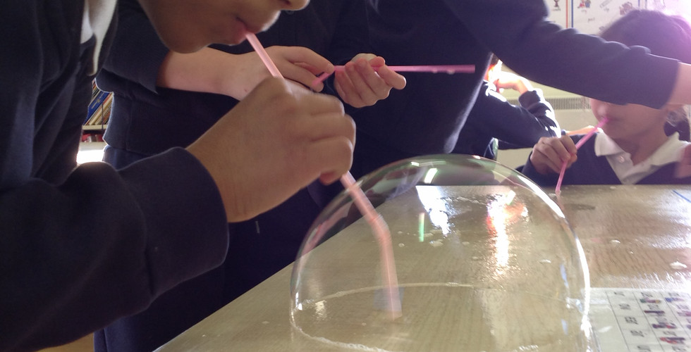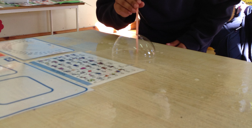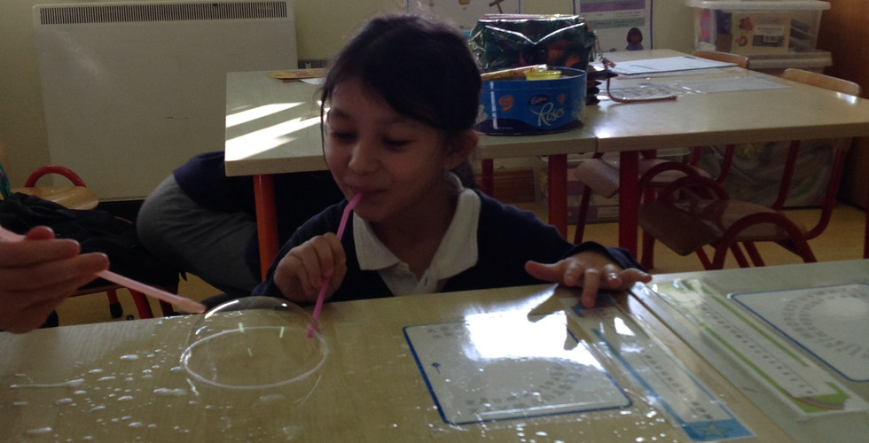 The first experiment we completed was 'The Bubble Experiment'. We blew really big bubbles by wetting the surface with water and dipping our straws into a soap and water solution. Then we blew on the desk surface and made big bubbles. Some of us even blew a bubble inside of a bubble.