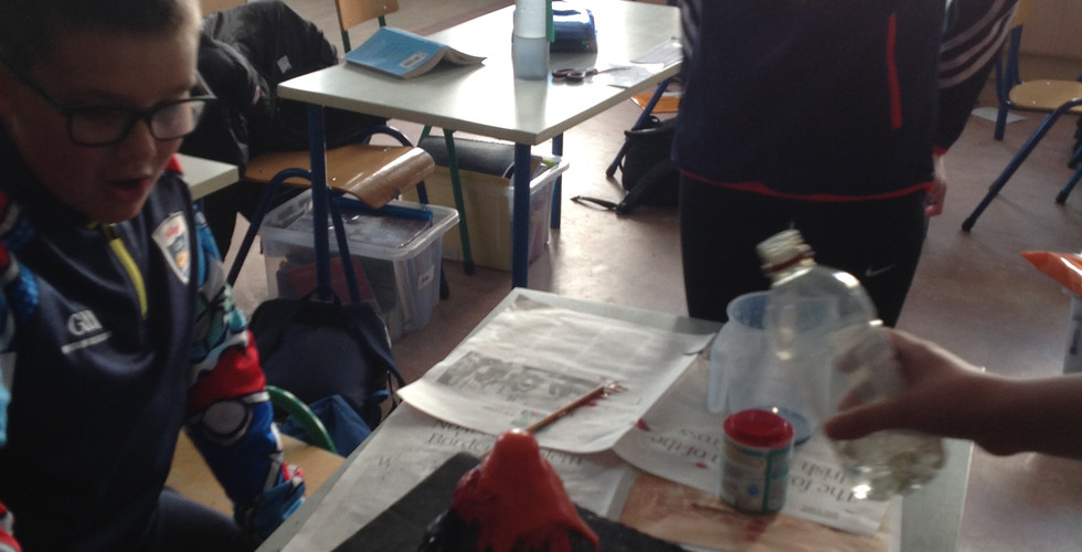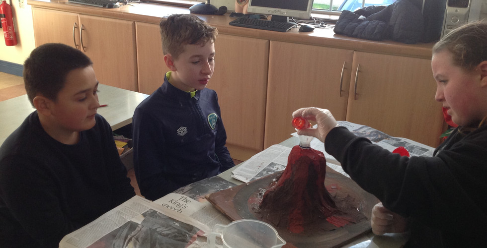 Fifth and Sixth class created volcanoes as part of Science Week. They made them using paper mache, tin foil, cardboard, a plastic bottle and paint.